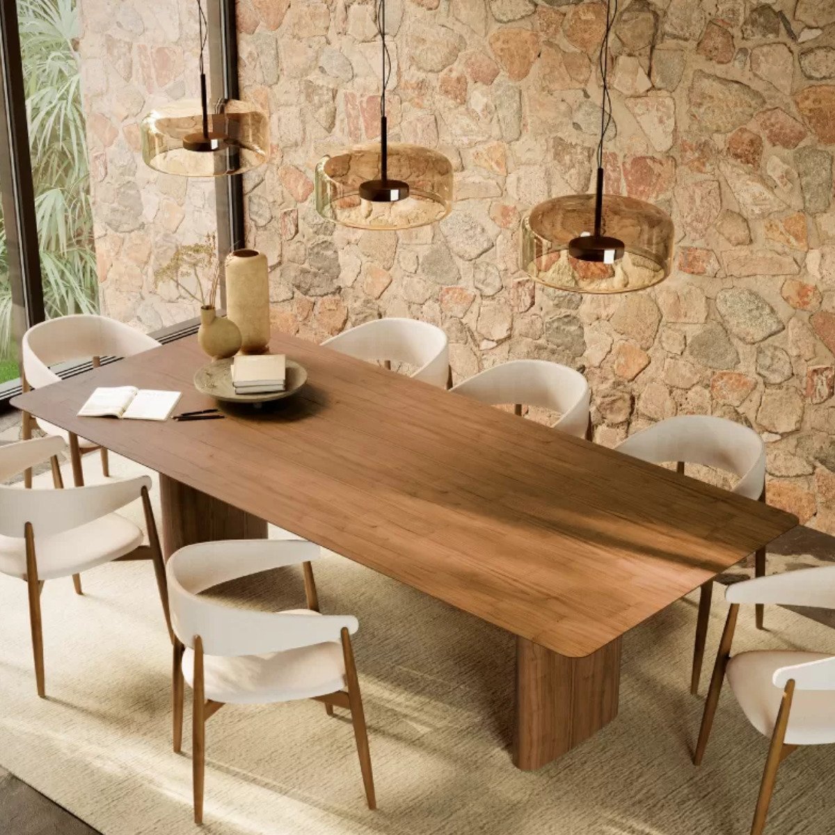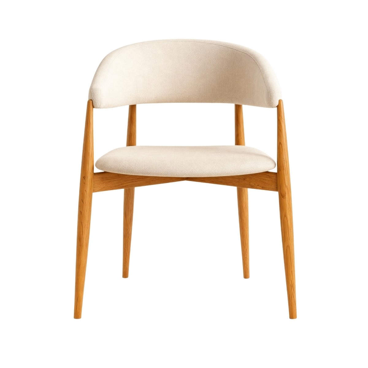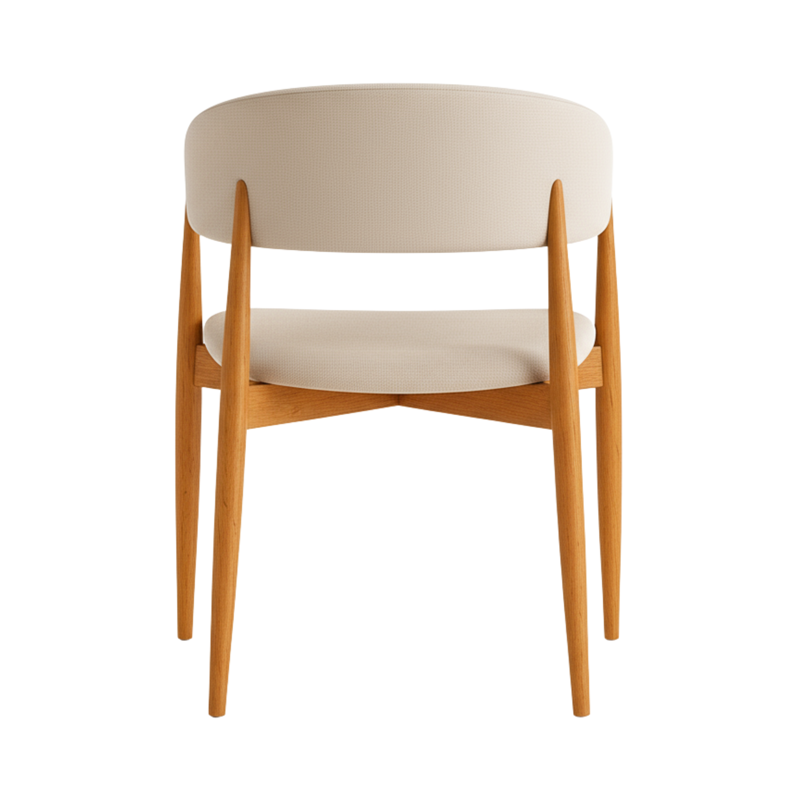 Aposte na Cadeira Vivi com mesas em tons claros ou médios para destacar sua estrutura de madeira. Tecidos neutros ou texturizados elevam a sensação de aconchego e sofisticação, especialmente em composições com iluminação suave.