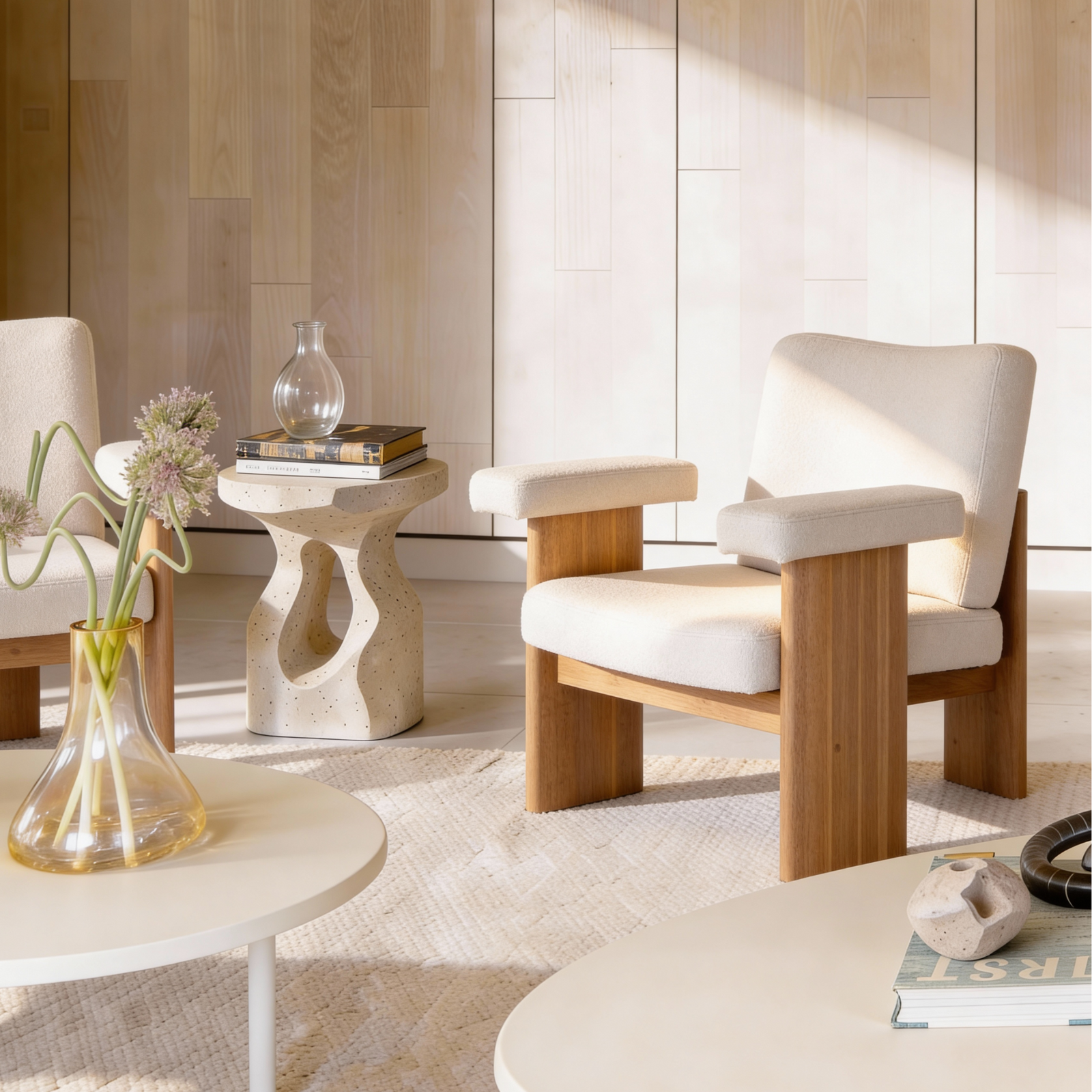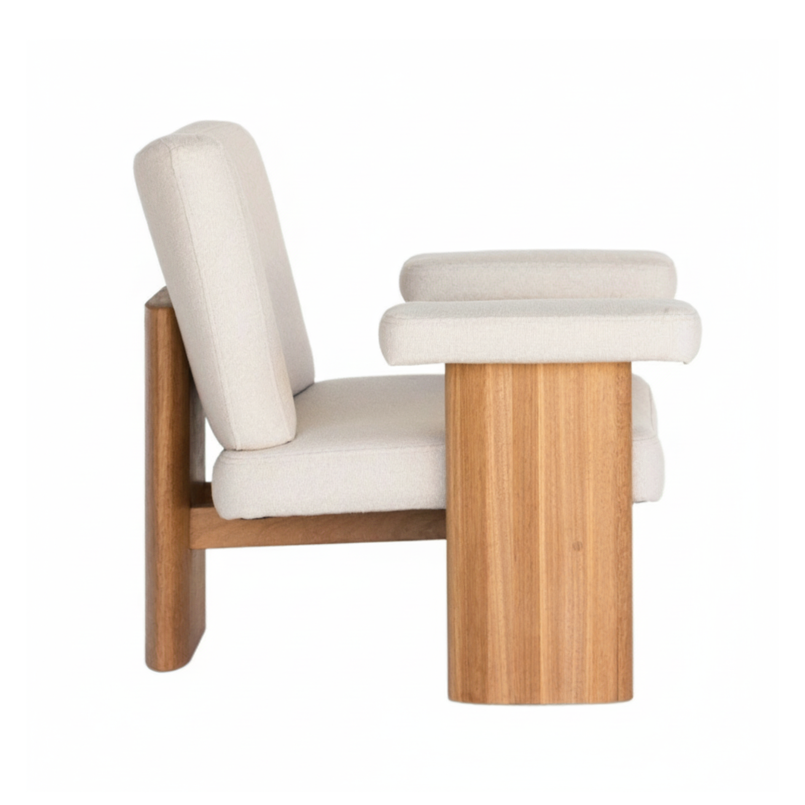 Experimente combinar a Poltrona Amélie com uma mesa de centro em madeira escura e almofadas de tecidos mais vibrantes para criar uma atmosfera acolhedora e moderna. O contraste entre a madeira Tauari e elementos metálicos ou de vidro pode realçar o charme do espaço.