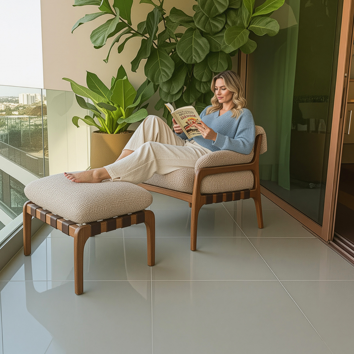 Combine a Cleo com uma poltrona Cloe e uma mesa lateral em madeira ou metal e uma luminária de piso para criar um canto de leitura impecável. Complete com mantas e almofadas em tons neutros ou terrosos para destacar os materiais naturais e deixar o ambiente mais acolhedor.